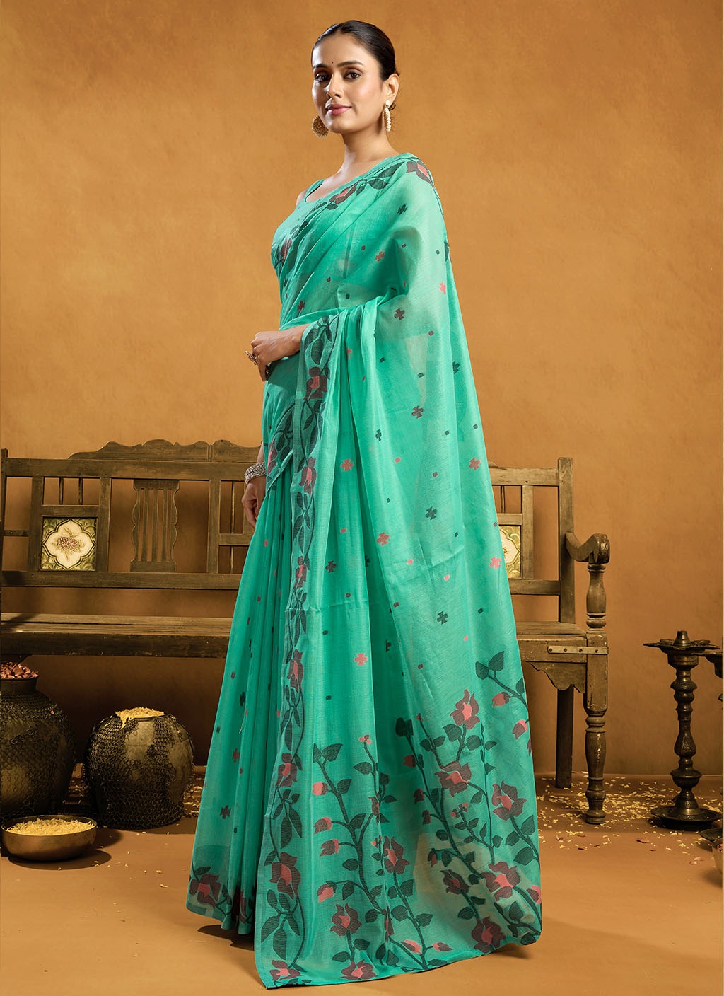 • Aqua Bloom – Sea Green Cotton Jamdani Saree with Pink & Black Floral Weave