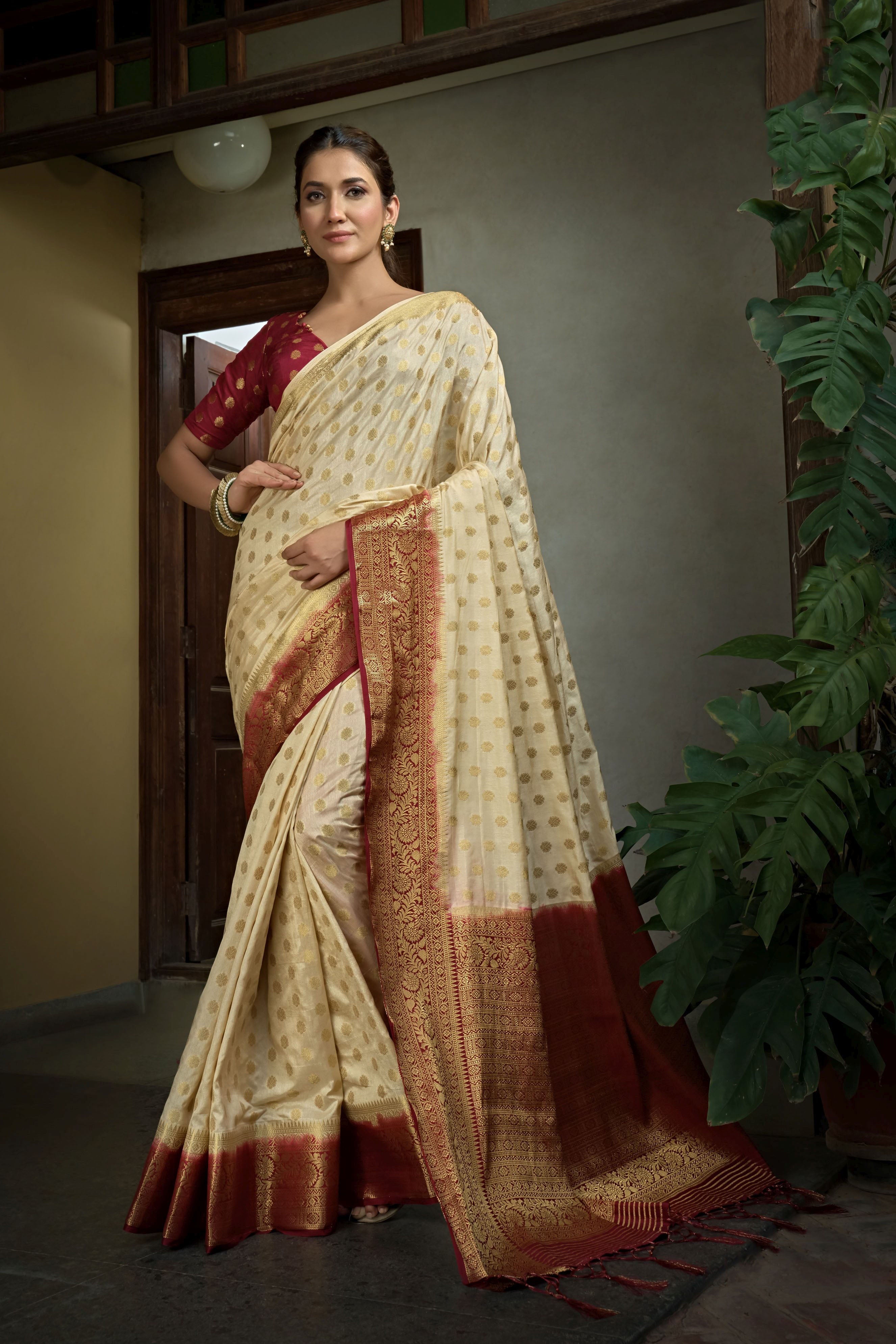 https://flipthefashion.com/products/beige-dola-silk-saree-maroon-blouse-zari-work