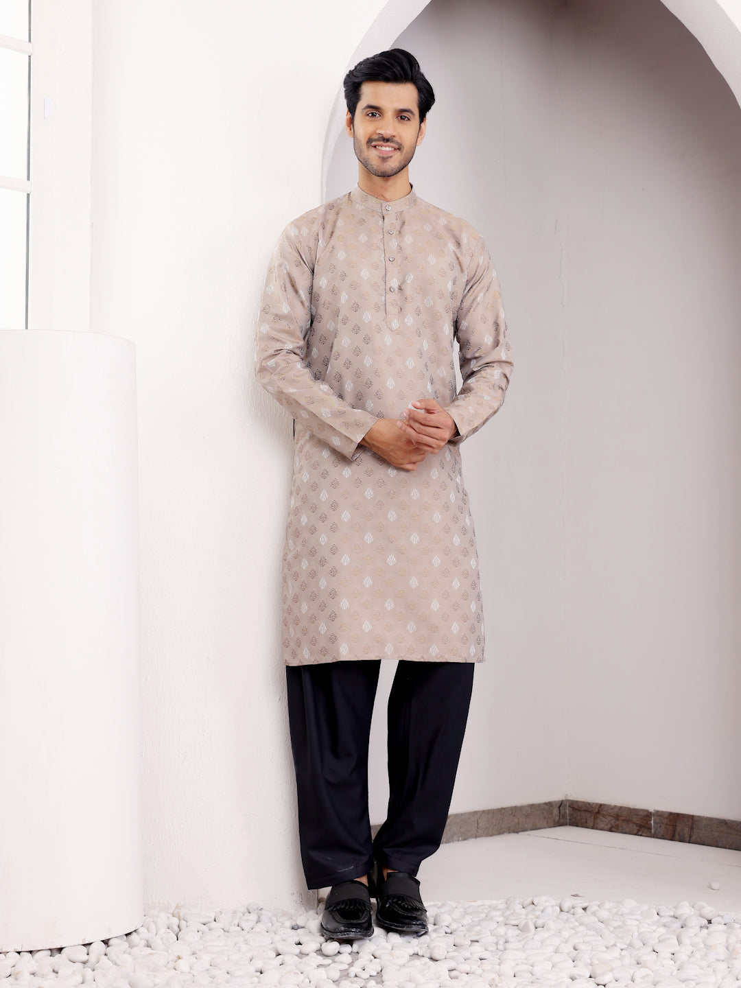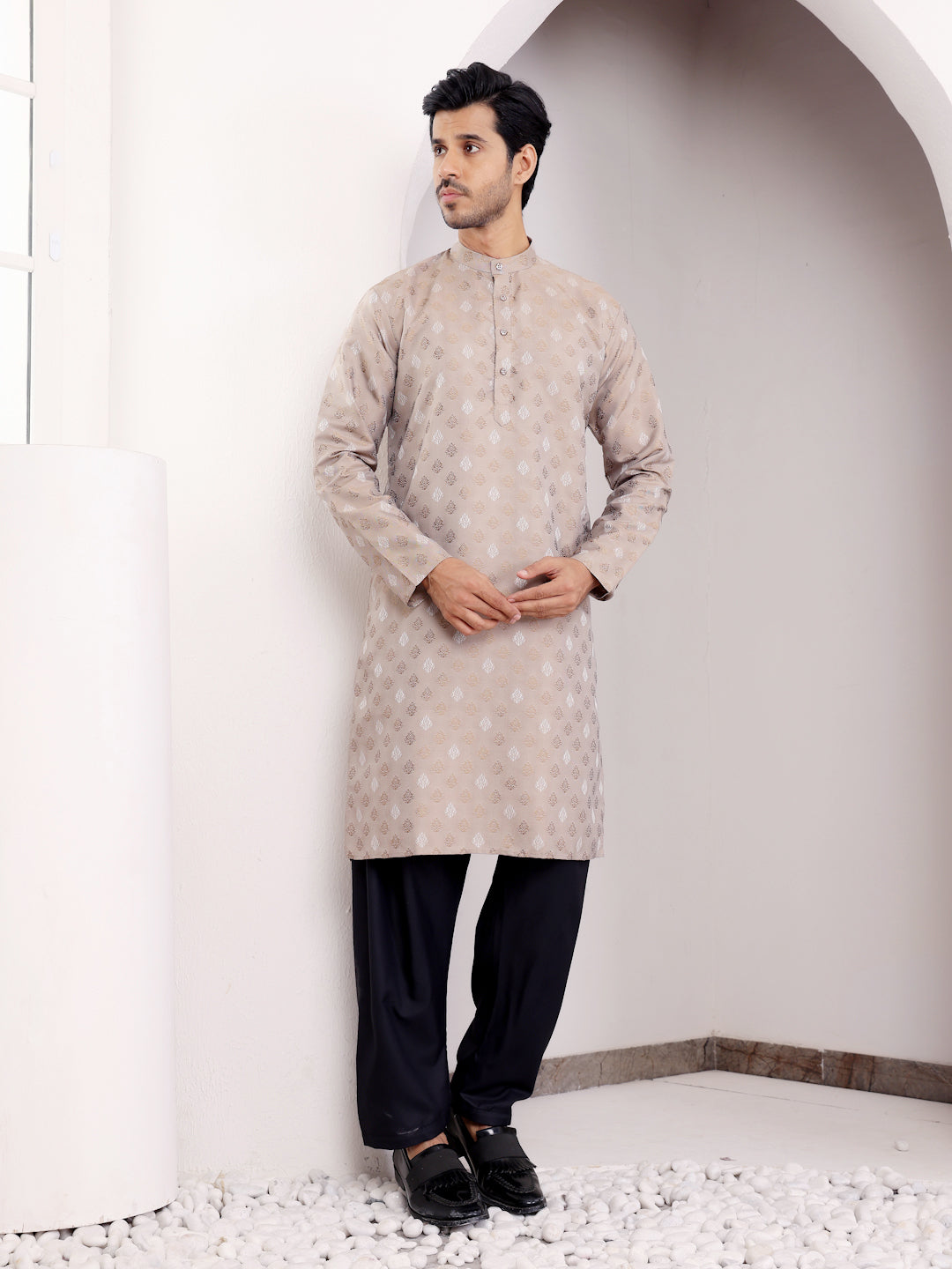 Beige Viscose Jacquard Kurta for Men – Perfect for Festive & Wedding Wear