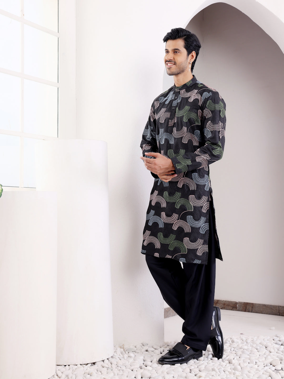 Description: Elevate your ethnic wardrobe with this elegant black kurta pajama set—perfect for festive occasions, family functions, and weddings. The kurta is crafted from rich linen fabric, adorned with intricate designer embroidery that adds timeless charm and class. The matching art silk pajama complements the kurta beautifully, creating a refined and polished look. Whether you're attending a traditional event or celebrating a joyous moment, this readymade set promises comfort, style, and sophistication. Ready to wear and guaranteed to turn heads—make it yours today!