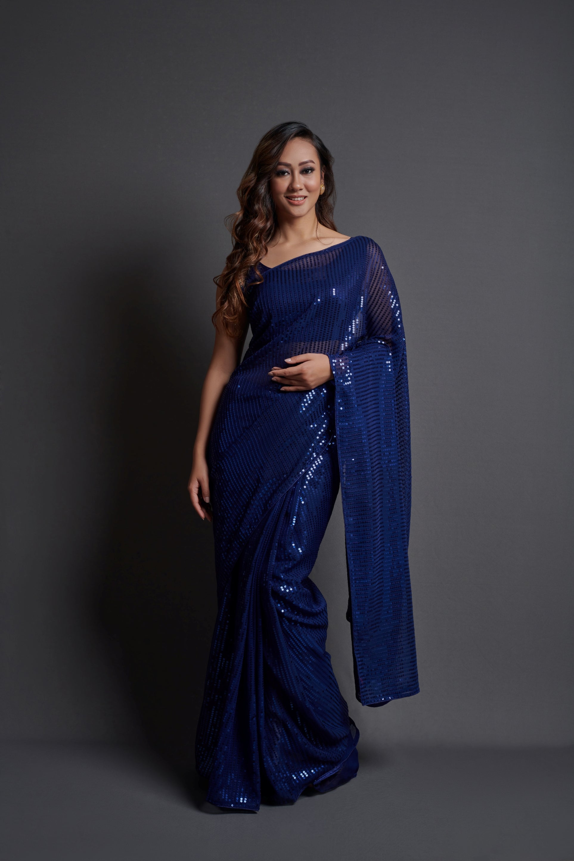 Blue Georgette Saree with Designer Sequins Embroidery & Banglori Silk Blouse