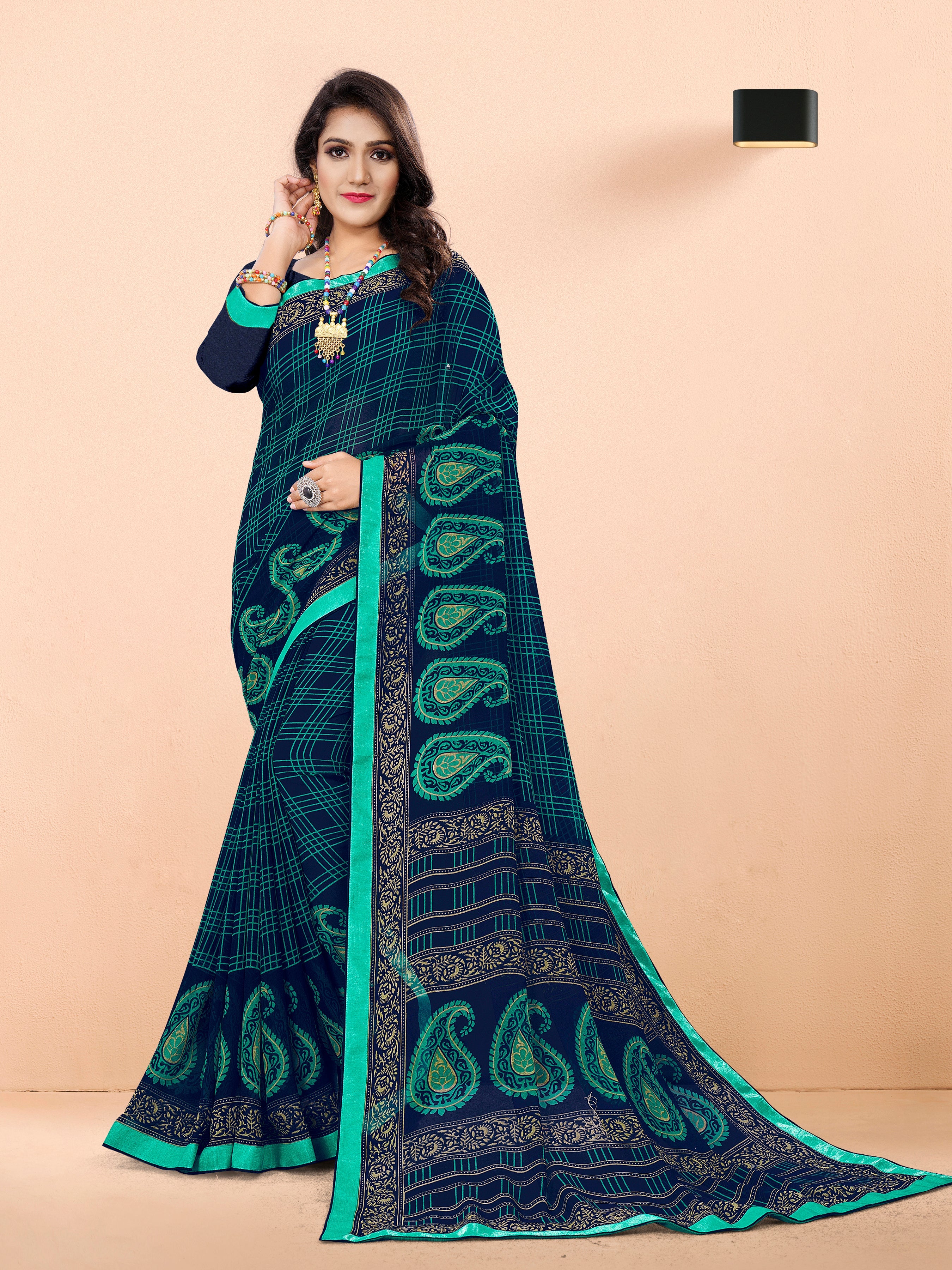 Blue Georgette Saree with Green Paisley & Checkered Print and Lace Border