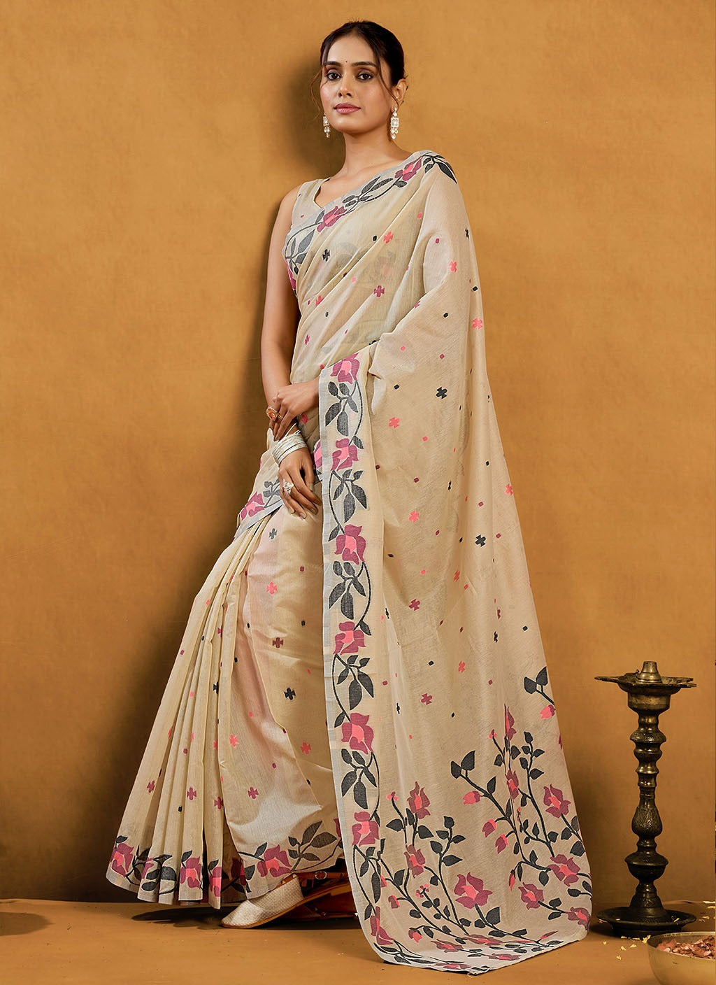 • Blush Bloom – Beige Cotton Jamdani Saree with Pink Floral Border