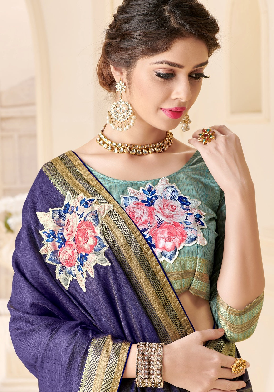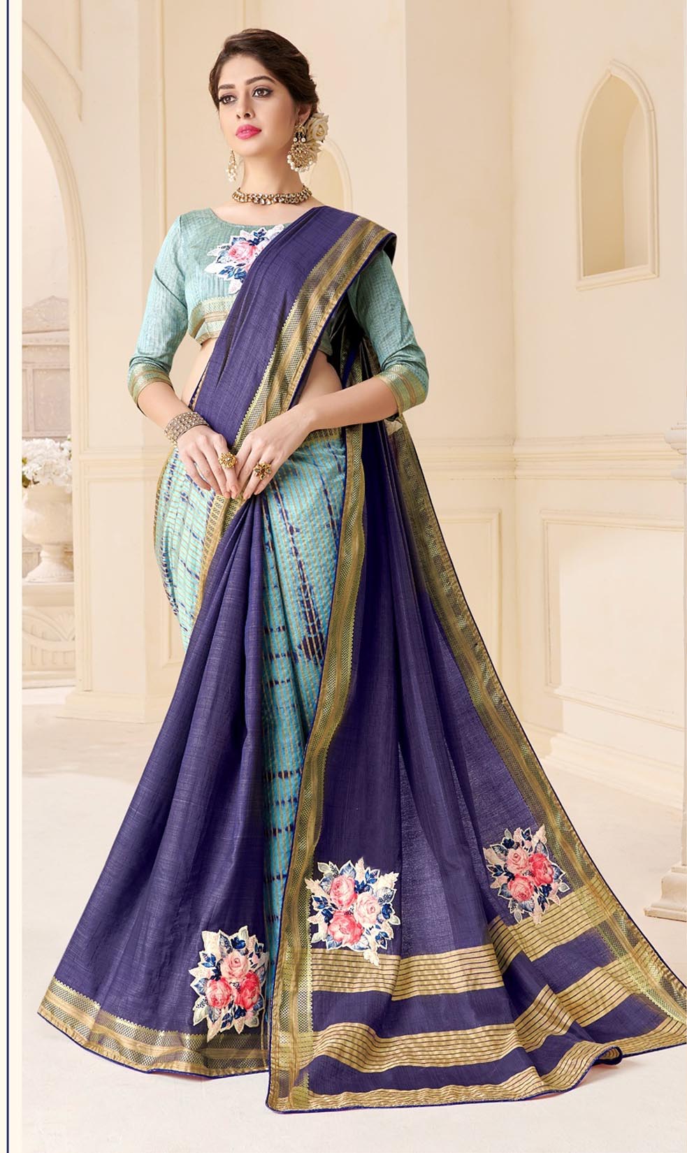 Elegant Blue Silk Saree with Golden Border & Floral Embroidery