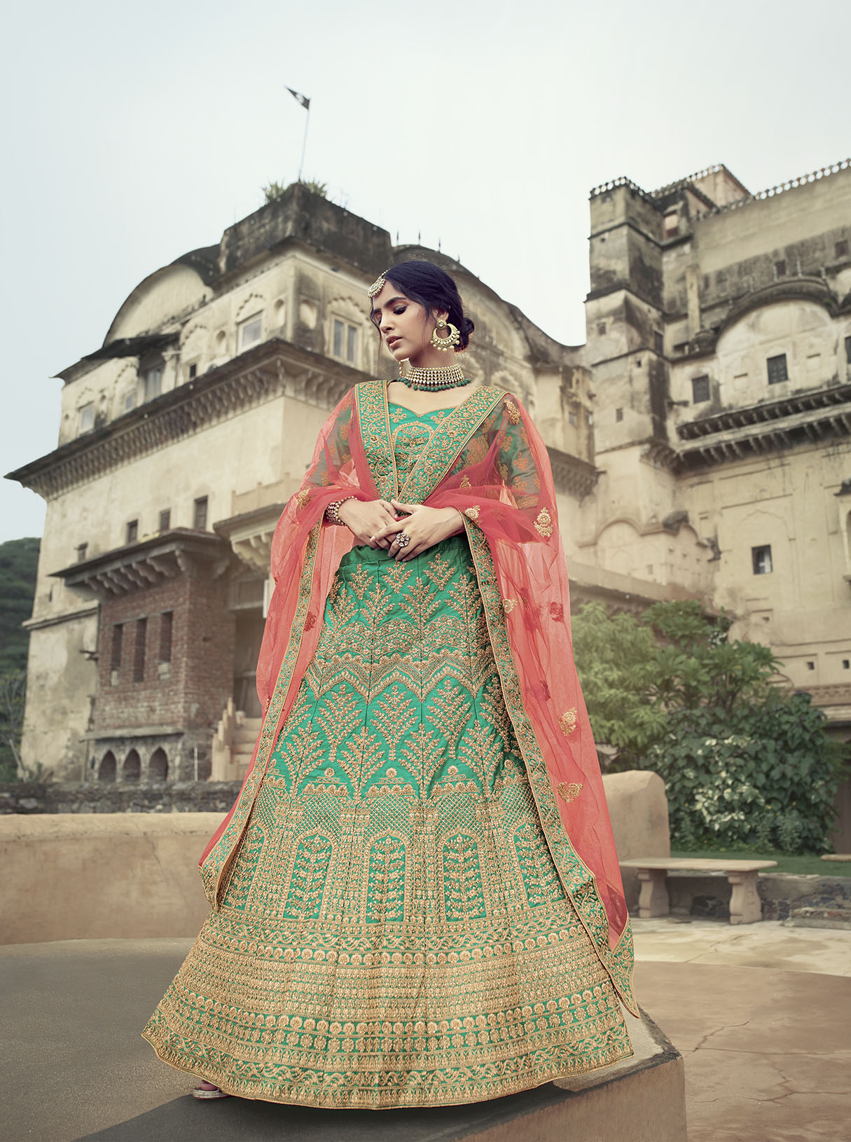 • Green & Peach Heavy Embroidered Satin Lehenga Choli with Net Dupatta