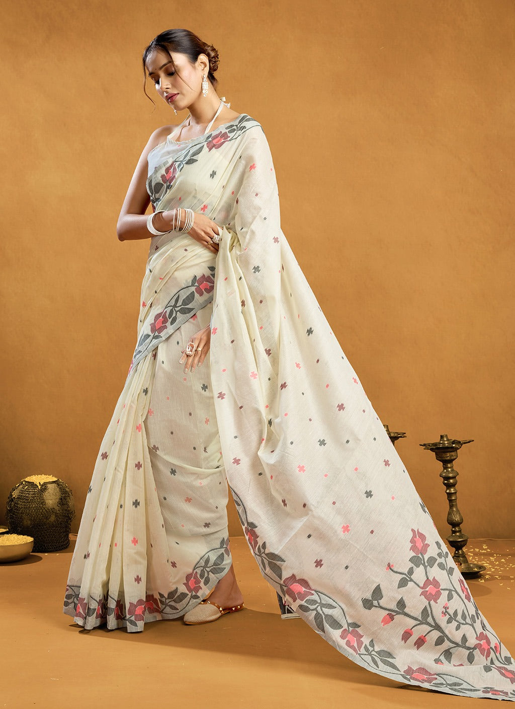 Ivory Bloom – Off-White Cotton Jamdani Saree with Pink Floral Border