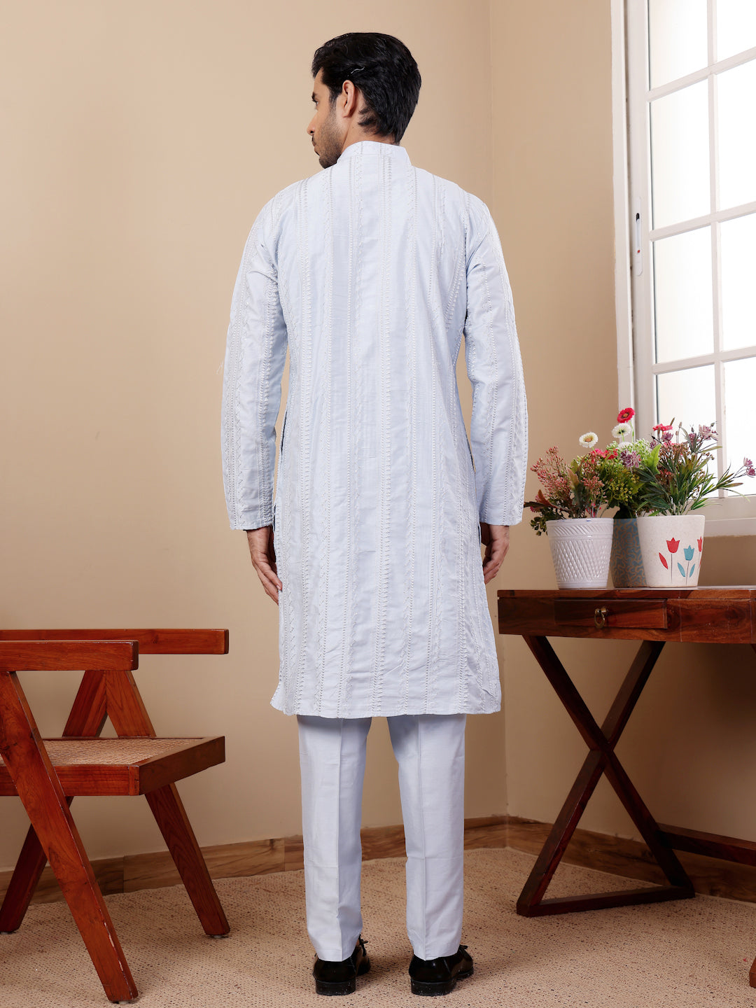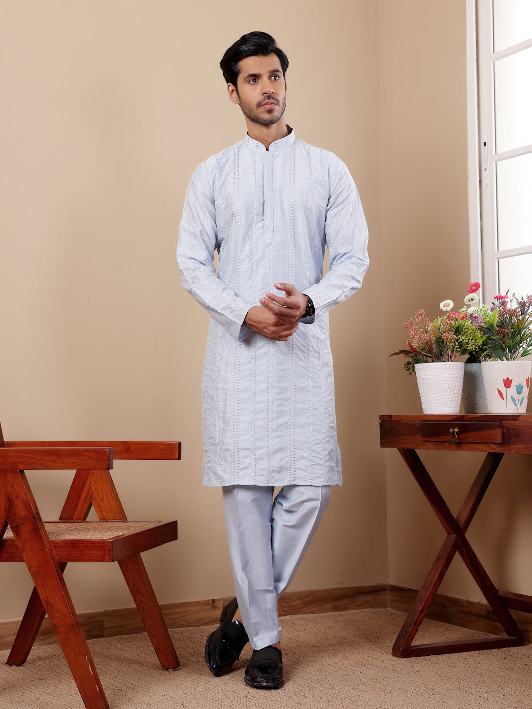 Light Blue Linen Kurta with Art Silk Payjama – Designer Embroidery Work