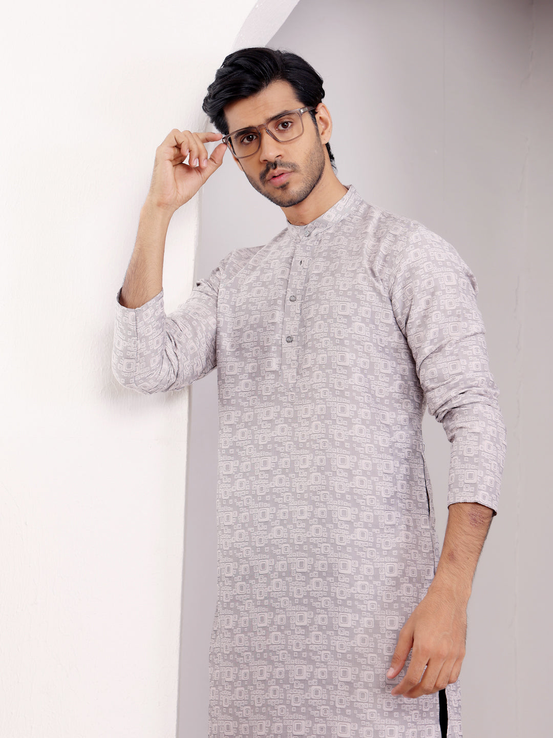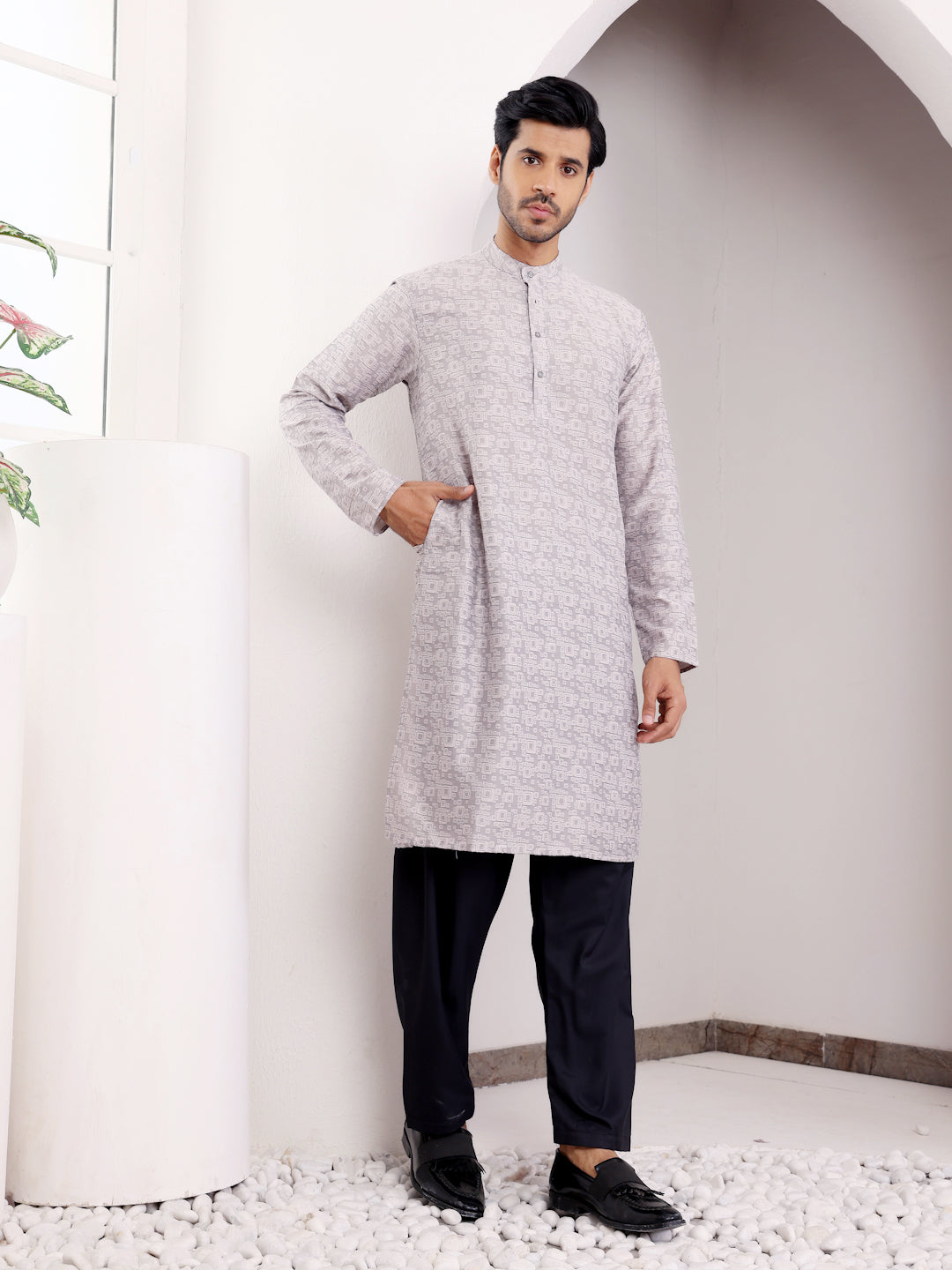 Textured Light Grey Printed Kurta for Men – Subtle Ethnic Elegance