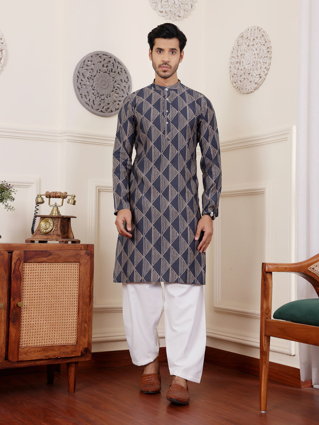 Men's Navy Blue Geometric Printed Kurta with White Pajama