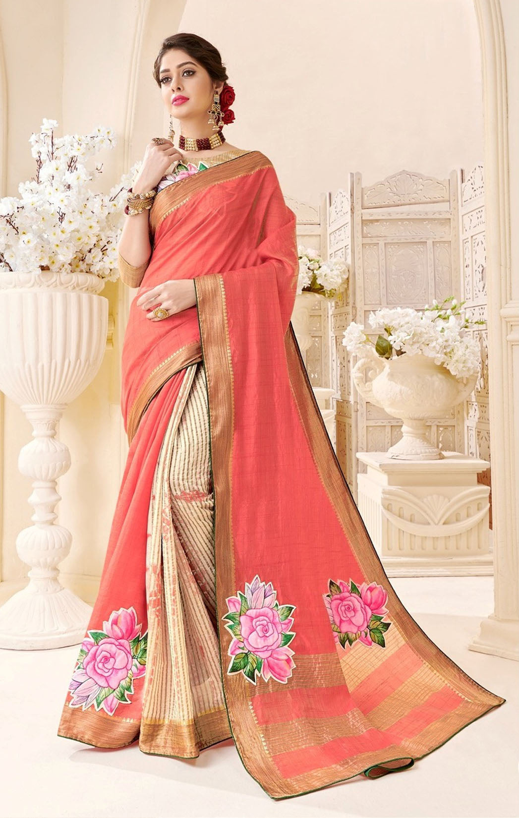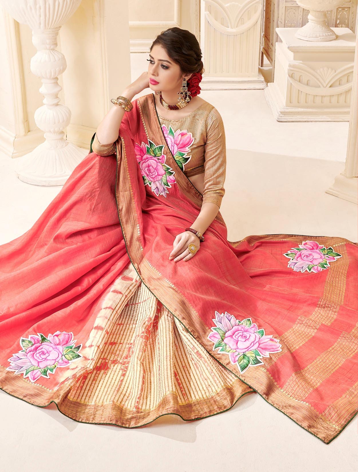 Peach & Beige Tassar Silk Half Half Saree with Floral Applique and Golden Border