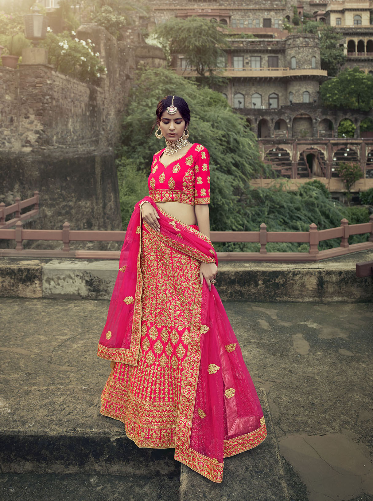 Pink Heavy Embroidered Satin Lehenga Choli with Net Dupatta