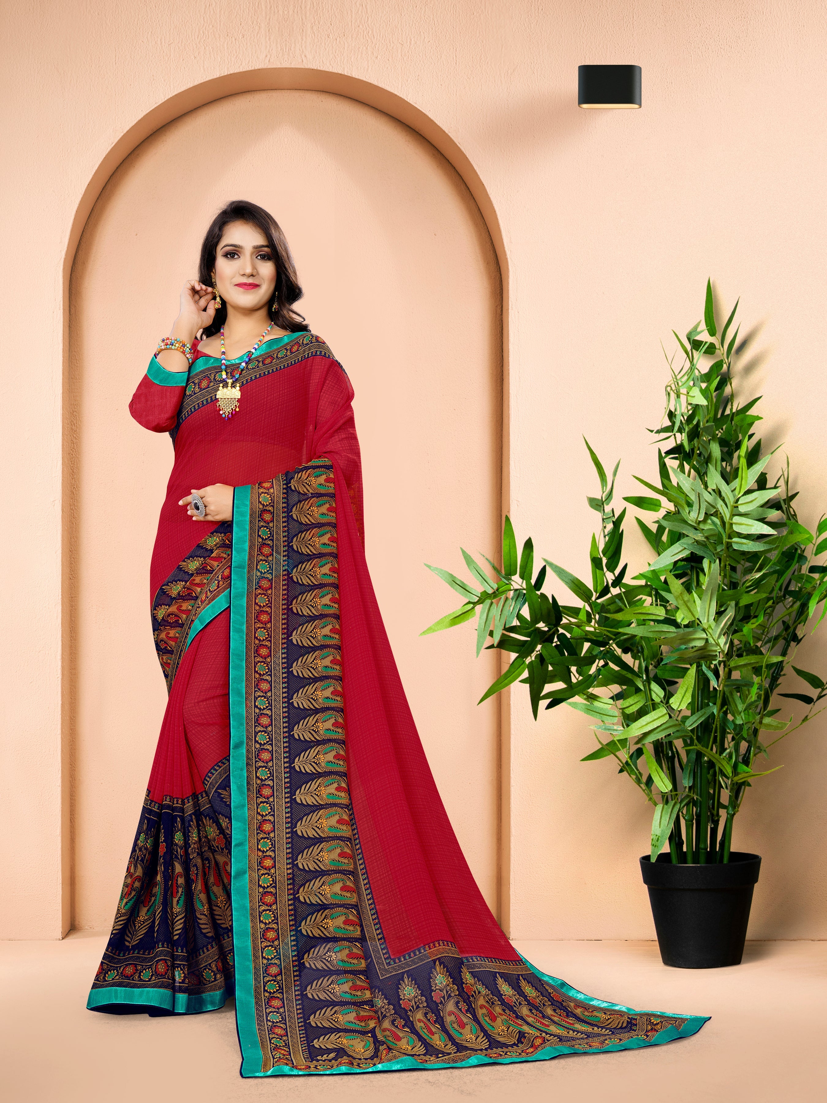 Red Georgette Saree with Multicolor Printed Border & Matching Blouse