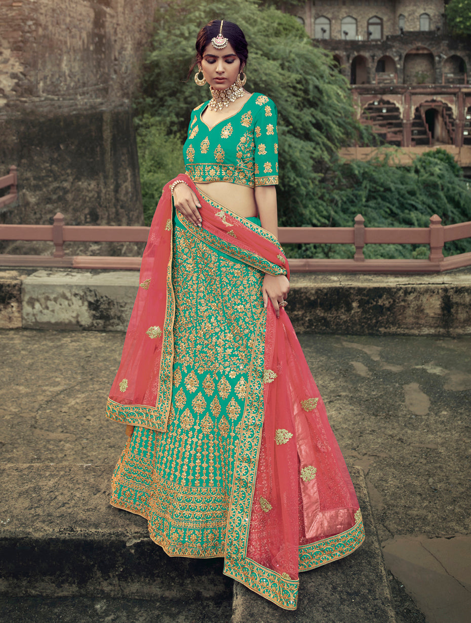 • Regal Green Golden Embroidered Lehenga Choli with Contrast Net Dupatta