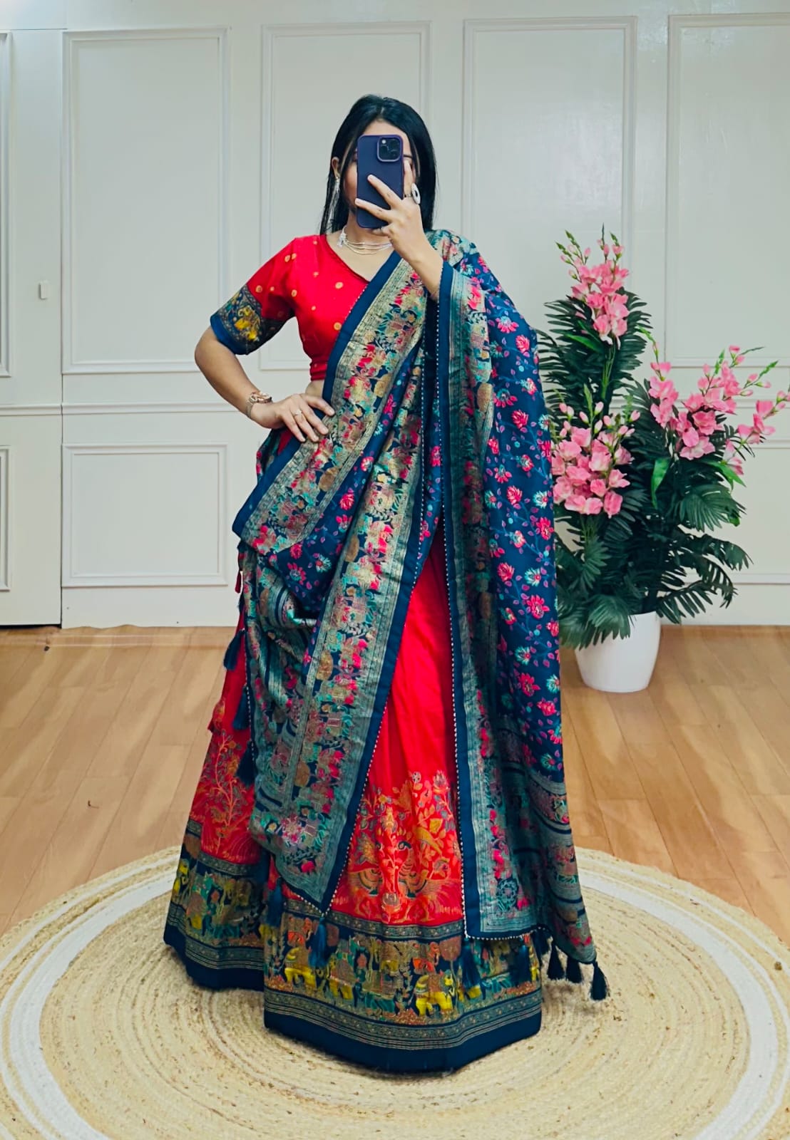 Description: Step into timeless elegance with this stunning red Tussar silk lehenga set. The lehenga showcases mesmerizing Kalamkari artwork accentuated with delicate foil work, creating a heritage-inspired ensemble. The navy-blue dupatta with intricate prints, tassels, and gotta patti lace border complements the vivid lehenga, offering a refined contrast. Perfect for festive and traditional occasions, this set includes an unstitched blouse and a fully flared lehenga lined with canvas and can-can for graceful movement.