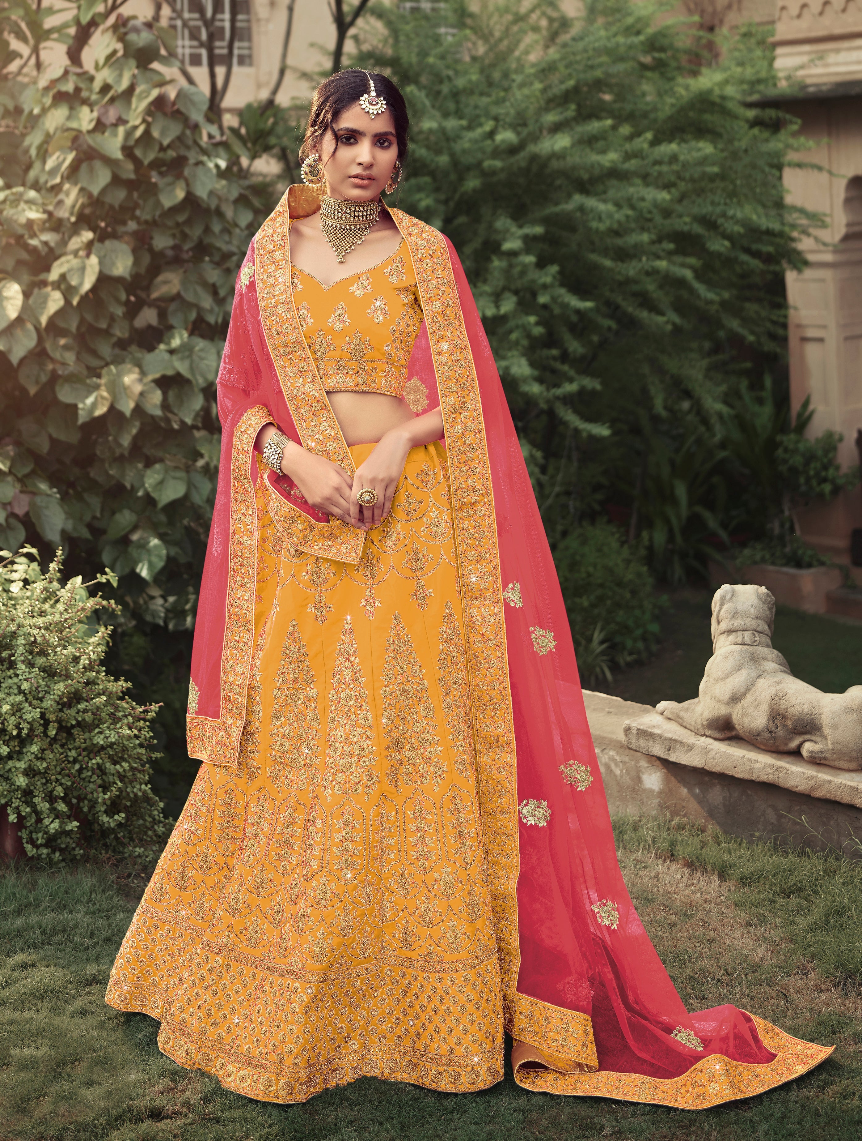 Sunshine Yellow Heavy Work Satin Lehenga Choli with Contrasting Dupatta